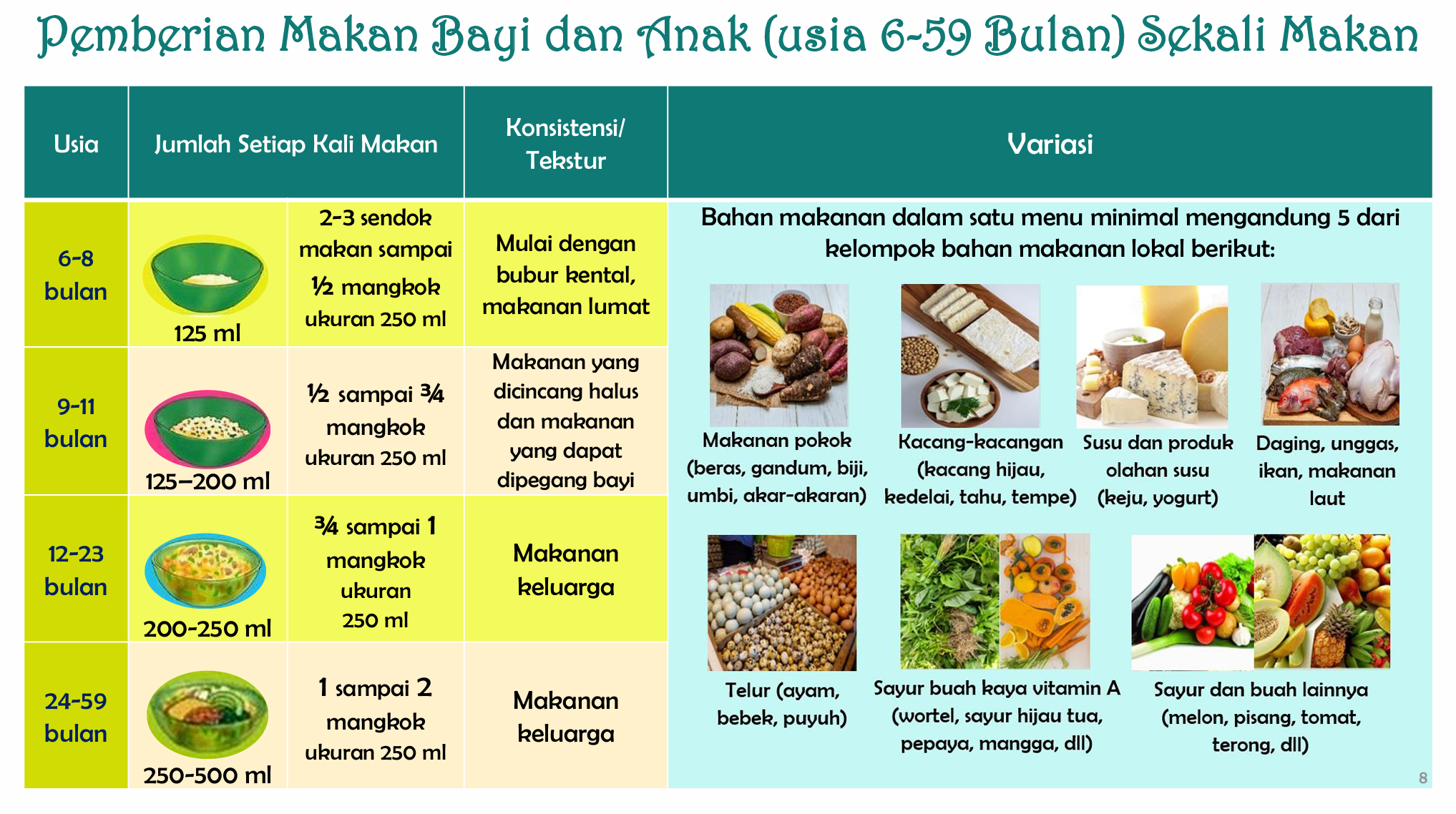 MPASI sering jadi momen yang bikin orang tua deg-degan. Mulai dari takut salah porsi, bingung tekstur makanan, sampai khawatir gizinya kurang. Padahal, dengan panduan yang tepat sesuai usia, MPASI bisa jadi proses yang lebih terarah dan menyenangkan untuk Si Kecil. Pemberian makan bayi dan anak Gambar di atas nunjukin cheat sheet MPASI buat bayi dan anak usia 6 sampai 59 bulan. Isinya lengkap banget: mulai dari usia anak, porsi sekali makan, tekstur makanan, sampai variasi bahan makanan yang wajib ada. Jadi orang tua nggak perlu nebak-nebak lagi, tinggal sesuaikan aja sama umur Si Kecil 👶🍽️